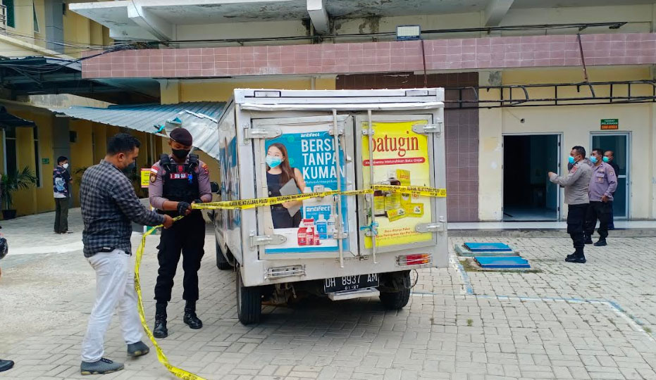 Setelah mengambil data dan keterangan, penyidik langsung memasang garis polisi di sekitar lokasi kejadian agar tidak dilintasi oleh pengunjung rumah sakit dan orang yang tidak berkepentingan.