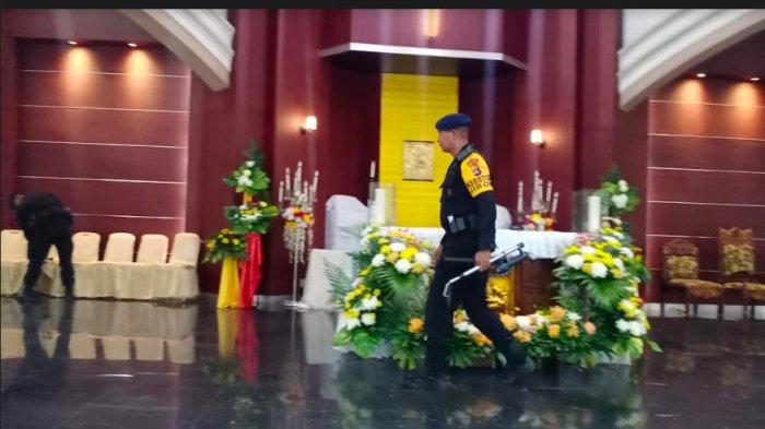 Personel Gegana melakukan pemeriksaan di setiap sudut di dalam gedung kebaktian, mimbar tempat berkhotbah, pengeras suara, alat pendingin