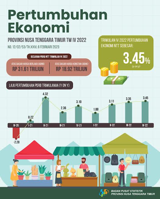 Badan Pusat Statistik merilis angka pertumbuhan ekonomi NTT triwulan IV-2022 pada Senin, 6 Februari 2023 menyatakan pertumbuhan Ekonomi triwulan IV-2022 dibandingkan dengan triwulan IV-2021 (y-on-y) tumbuh sebesar 3,45 persen.