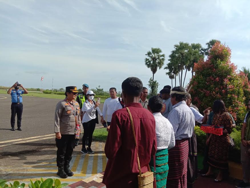 Dia bersama rombongan tiba di bandara Wunopito Lewoleba. Kepadanya juga dipakaikan sarung tenun khas Lembata oleh penjabat Bupati Lembata Marsianus Jawa.