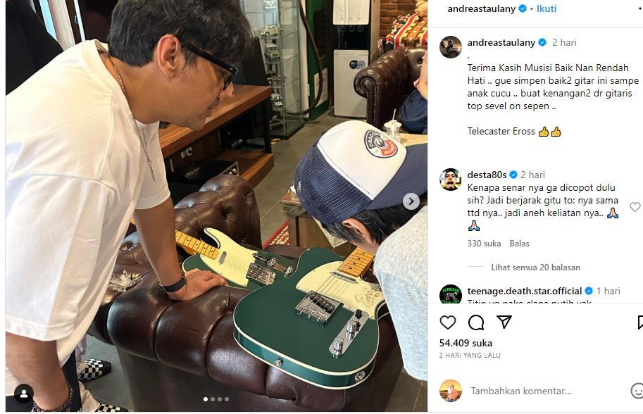 Viral Andre Taulany membagikan momen saat dirinya diberikan gitar oleh gitaris band Sheila on Seven, Eross Chandra.