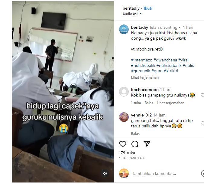 Dalam video tersebut terlihat seorang guru sedang menulis di papan tulis putih menggunakan spidol warna hitam dengan cara terbalik.