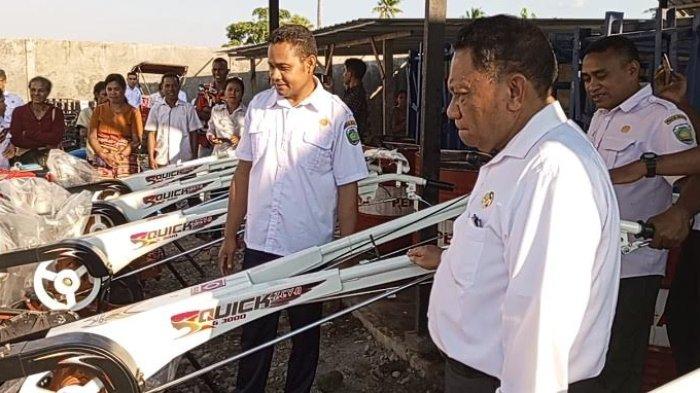 POS KUPANG. COM, BETUN - Bupati Malaka, Simon Nahak didampingi Kepala Dinas Pertanian dan Ketahanan Pangan, drh.Januaria Maria Seran menyerahkan puluhan alat dan mesin pertanian (Alsintan) kepada kelompok tani.