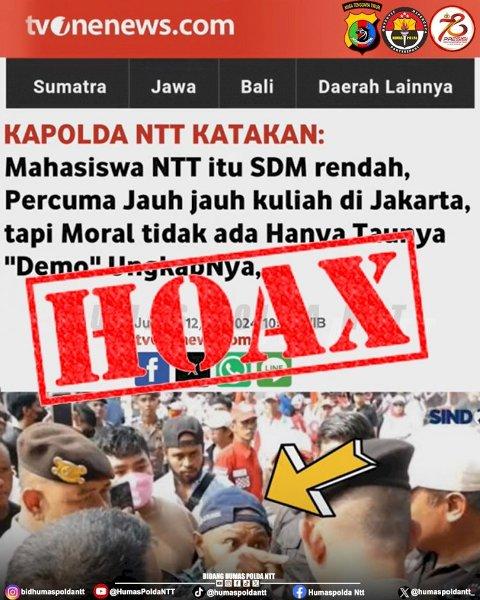 “Postingan tersebut merupakan hoax yang dilakukan oleh pihak yang tidak bertanggung jawab dengan tujuan untuk memprovokasi pihak Ormas Flobamora dan Aliansi Petir di Jakarta terkait aksi unras permasalahan kelulusan 11 catar Akpol dari Polda NTT, yang minim putra daerah. Setelah kita kroscek ke pihak tvonenews.com, mereka tidak pernah meliput hal tersebut. Untuk pembuat dan penyebar konten tersebut akan kita kejar sampai ketangkap,” tegasnya