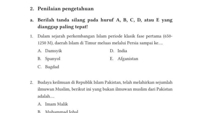 Temukan soal-soal berikut dalam buku Pendidikan Agama Islam dan Budi Pekerti untuk SMA/SMK/MA Kelas XII, Bab 5 Perkembangan Peradaban Islam di Dunia.