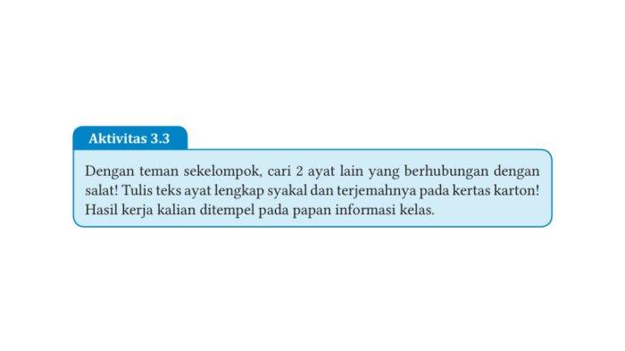 Dengan teman sekelompok, cari 2 ayat lain yang berhubungan dengan salat! Tulis teks ayat lengkap syakal dan terjemahnya pada kertas karton! Hasil kerja kalian ditempel pada papan informasi kelas.