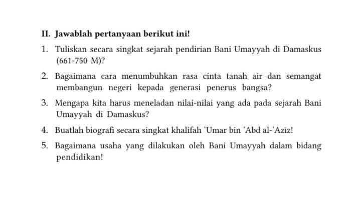 Soal-soal berikut ada dala buku Pendidikan Agama Islam dan Budi Pekerti untuk SMP Kelas VII, Bab V: Damaskus: Pusat Peradaban Timur Islam (661-750 M).