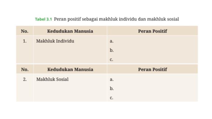 Selamat! Kalian telah mempelajari materi tentang manusia sebagai makhluk Tuhan Yang Maha Esa. Sekarang, kalian dapat mengidentiikasi diri kalian masing-masing mengenai peran positif yang biasa kalian lakukan sebagai makhluk individu dan makhluk sosial yang bermanfaat untuk diri sendiri dan orang lain. Langkah yang harus kalian lalui untuk menyelesaikan aktivitas ini adalah sebagai berikut.