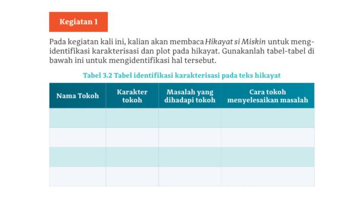 Pada kegiatan kali ini, siswa diminta mengidentifikasi karakter dan plot pada hikayat berjudul "Hikayat si Miskin".