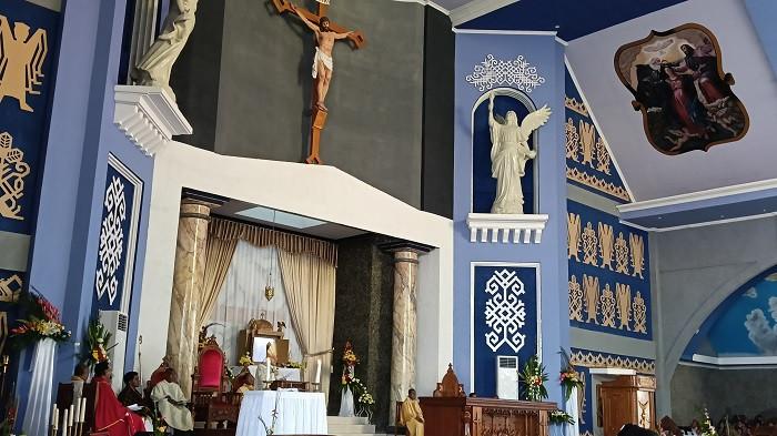 “Seperti yang dikatakan Santo Paulus kepada kita dalam bacaan kedua, gereja yang indah ini yang dibangun selaras dengan budaya kita mengingatkan kita bahwa melalui baptisan kita semua adalah bangunan Allah. Artinya Allah telah menciptakan dan mengumpulkan kita sebagai satu bangsa yang kudus dan kita dengan nikmat kekuatan dari gereja ini harus menjaga diri kita suci, murni, selalu terarah kepada Allah dan selalu terarah kepada sesama kita, 100 persen Katolik, 100 % Indonesia,” lanjutnya.