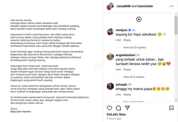 Raisa dan Hamish Daud tak bisa lagi mempertahankan rumah tangga yang sudah dibinanya selama 8 tahun. Mereka sepakat untuk berpisah secara baik-baik.