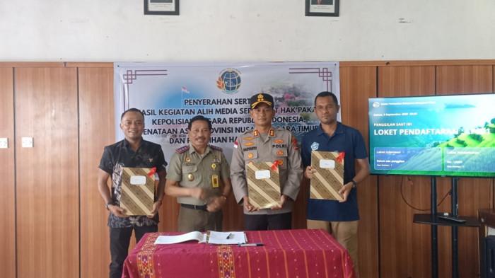 Kantor Pertanahan Kabupaten Manggarai Timur menyerahkan sertipikat tanah elektronik kepada Polres Manggarai Timur dan SMAN 6 Kota Komba.