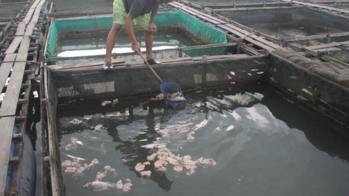 Ribuan ikan yang dibudidayakan dalam keramba jaring apung di Sungai Martapura, Banjarmasin, Kalimantan